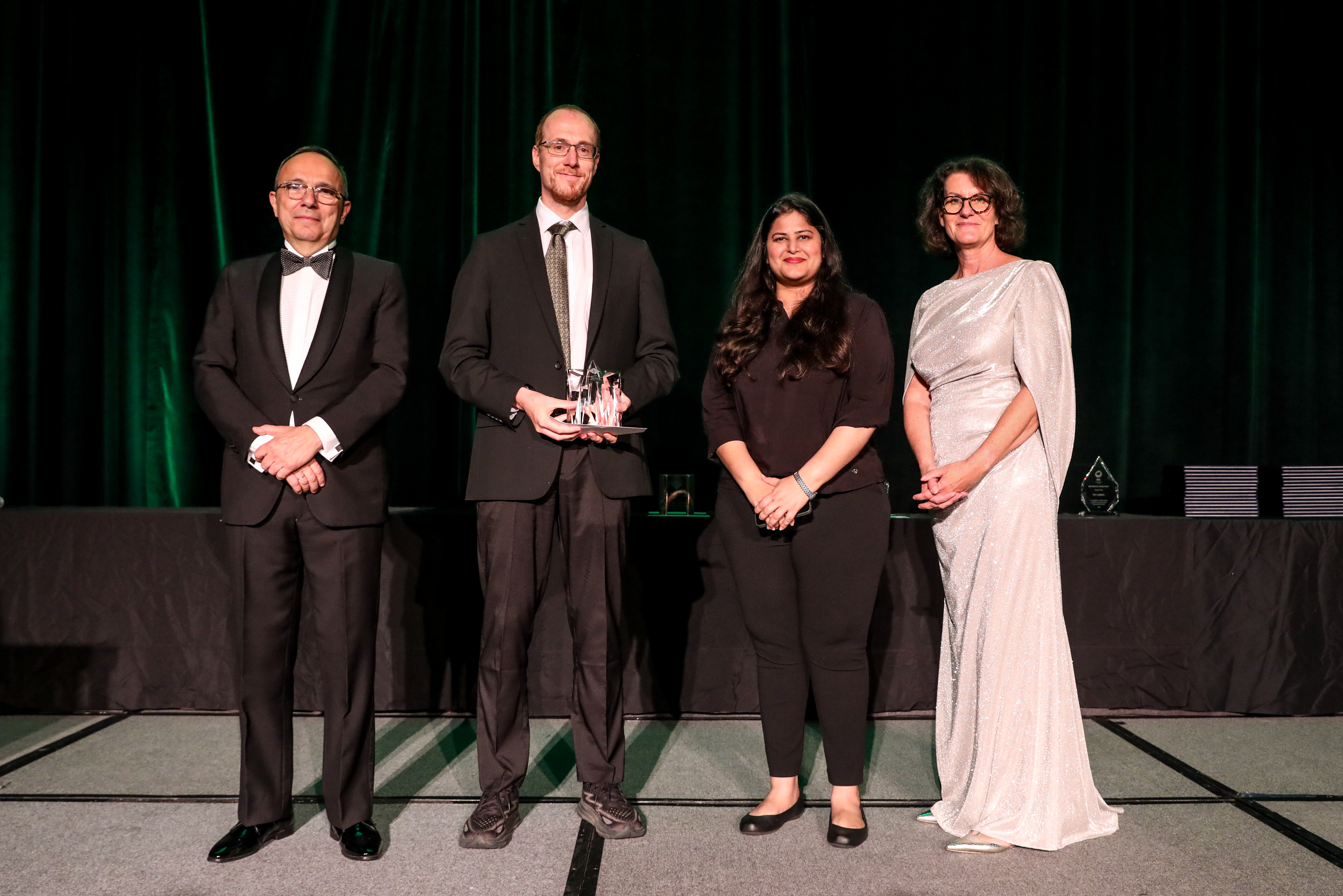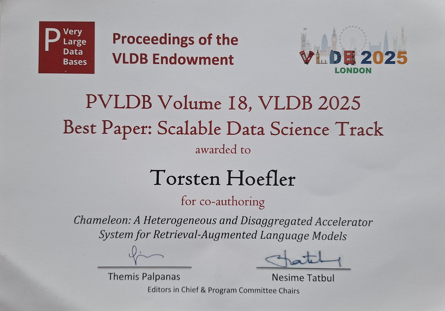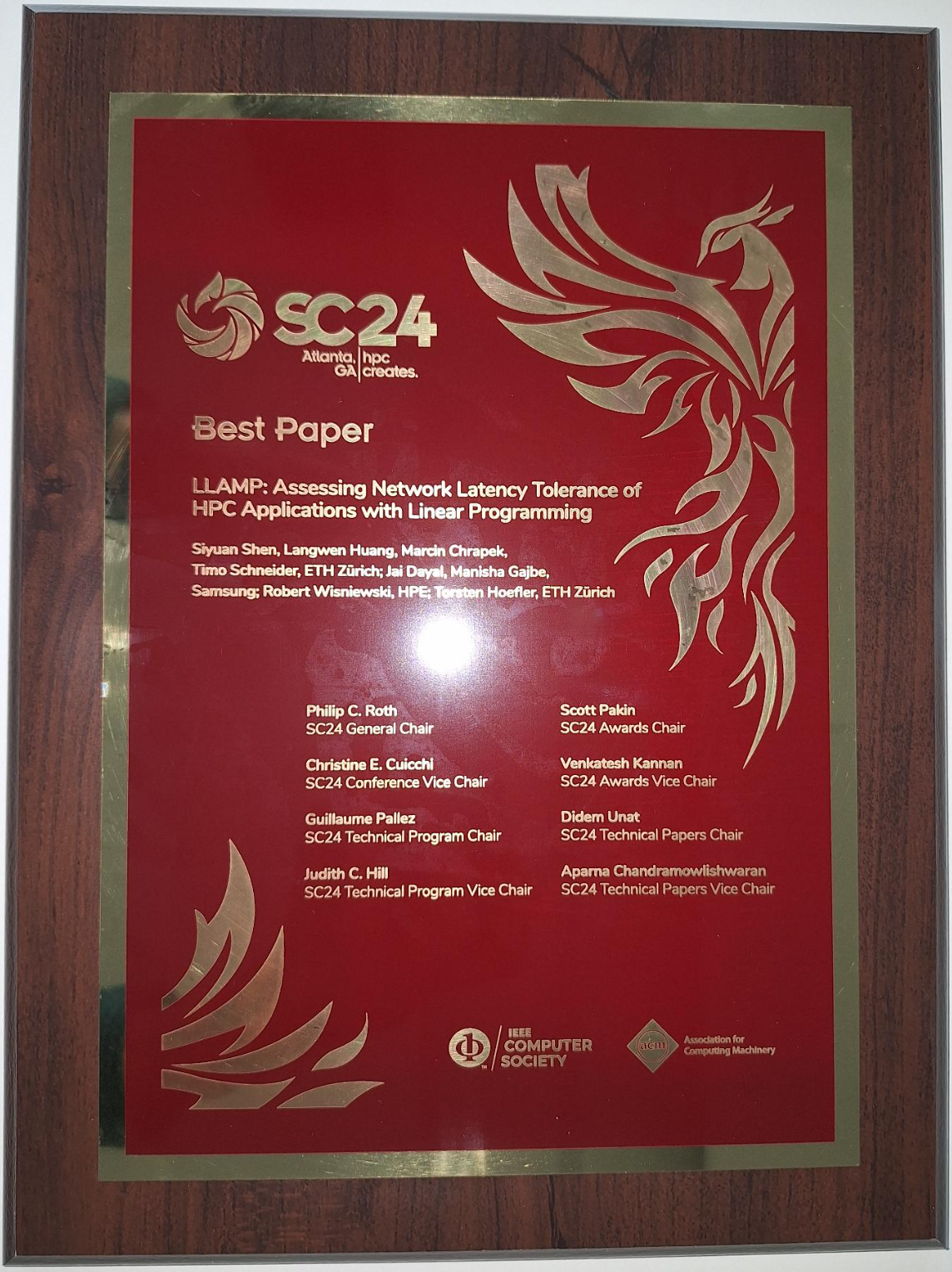 ![]() 2022 SIGHPC Certificate of Appreciation (SC22) with A. Ziogas and others 2022 IEEE Fellow "for contributions to large-scale parallel processing systems and supercomputers" 2021 Distinguished Paper Award at ACM Symposium on Object-oriented Programming, Systems, Languages, and Applications (OOPSLA'21) With A. Pitchanathan, C. Ulmann, M. Weber, T. Grosser 2021 HPC Wire People to Watch https://www.hpcwire.com/people-to-watch-2021/ "... selected for your leadership role within your organization and more specifically for the impact you will have on the HPC community and ecosystem globally. Your leadership, accomplishments and technologies will shape not only the future of our industry but will make a difference in the quality of life on our planet today and for generations to come. In its 10th year, this annual, short list of the Who’s Who in HPC includes the most accomplished computing professionals on the planet." 2020 International BenchCouncil Rising Star Award The BenchCouncil Rising Star Award is given to a young scholar who has made outstanding contributions to the field of benchmarking, measurement and optimization. The winner of this award will be automatically elected as a Senior Member of the ISTC [...]. ($1000 award and keynote at the Bench'20 conference, digitally due to COVID-19) 2019 ACM Gordon Bell Prize The Gordon Bell Prize is awarded each year to recognize outstanding achievement in high-performance computing. The purpose of the award is to track the progress over time of parallel computing, with particular emphasis on rewarding innovation in applying high-performance computing to applications in science, engineering, and large-scale data analytics. ($10,000 award) 2019 Best Student Paper Award ACM/IEEE Supercomputing (SC19) With G. Kwasniewski (advised Ph.D. student) and others 2019 IEEE TCSC Award of Excellence (MCR) for contributions on all aspects of large-scale scalable parallel processing systems and supercomputers 2019 Mentoring the Swiss Student Cluster Competition Team I mentored the successful Racklette Team at the ISC'19 Student Cluster Competition (they won themselves!) 2017 Teaching Award in the category "Best Interaction" decided by democratic vote of the student body at ETH 2017 Best Student Paper Award at IEEE Symposium on Hot Interconnects With Pedro Yébenes , Jesus Escudero-Sahuquillo, Pedro J. Garcı́a, Francisco J. Quiles 2016 Outstanding Paper Award at ACM Symposium on Object-oriented Programming, Systems, Languages, and Applications (OOPSLA'16) With A. Dan, P. Lam, M. Vechev 2016 Best Student Paper Award at IEEE Symposium on Hot Interconnects With T. Schneider (advised Ph.D. student), O. Bibartui (advised M.Sc. student) 2016 Karsten Schwan Best Paper Award at ACM Symposium on High-Performance Parallel and Distributed Computing (HPDC'16) With P. Schmid (advised BSc student) and M. Besta (advised Ph.D. student) 2015 Latsis Prize of ETH Zürich Press release 2015 Best Student Paper Award at IEEE Symposium on Hot Interconnects With S. Di Girolamo (advised Ph.D. student), P. Jolivet (advised postdoc), K. D. Underwood 2015 Best Paper at ACM Symposium on High-Performance Parallel and Distributed Computing (HPDC'15) With M. Besta (advised Ph.D. student) 2015 Best Paper at IEEE International Parallel & Distributed Processing Symposium (IPDPS) With R. Bellii (advised MSc student) 2014 Best Student Paper Award ACM/IEEE Supercomputing (SC14) With M. Besta (advised Ph.D. student) 2014 Indiana University SoIC Young Alumni Award 2013 IEEE/TCSC Young Achievers Award 2013 Best Paper Award ACM/IEEE Supercomputing (SC13) With R. Gerstenberger & M. Besta 2013 Best Paper Award EuroMPI'13 With T. Schneider & F. Kjolstad 2012 SIAM SIAG/SC Junior Scientist Prize Press release 2011 Best Poster Award PPoPP'11 With J. Willcock, N. Edmonds and A. Lumsdaine2010 Best Paper Award ACM/IEEE Supercomputing (SC10) With T. Schneider and A. Lumsdaine2010 Best Paper Award LSAP'10 With T. Schneider and A. Lumsdaine2009 Best Paper Award LCI'09 With J. Mueller, T. Schneider, J. Domke, R. Geyer, M. Haesing, S. Hoehlig, G. Juckeland, A. Lumsdaine, M. Mueller and W. Nagel2008 Cluster Challenge Champion SC'08 With J. Domke, R. Geyer, J. Mueller, W. E. Nagel, G. Juckeland, C. Beckley, V. Savage, T. Schneider, A. LumsdainePress release 2005 Universitätspreis 2005 (Best Student Award) Press release2005 PARS Nachwuchspreis 2005 (PARS Junior Researcher Award) |